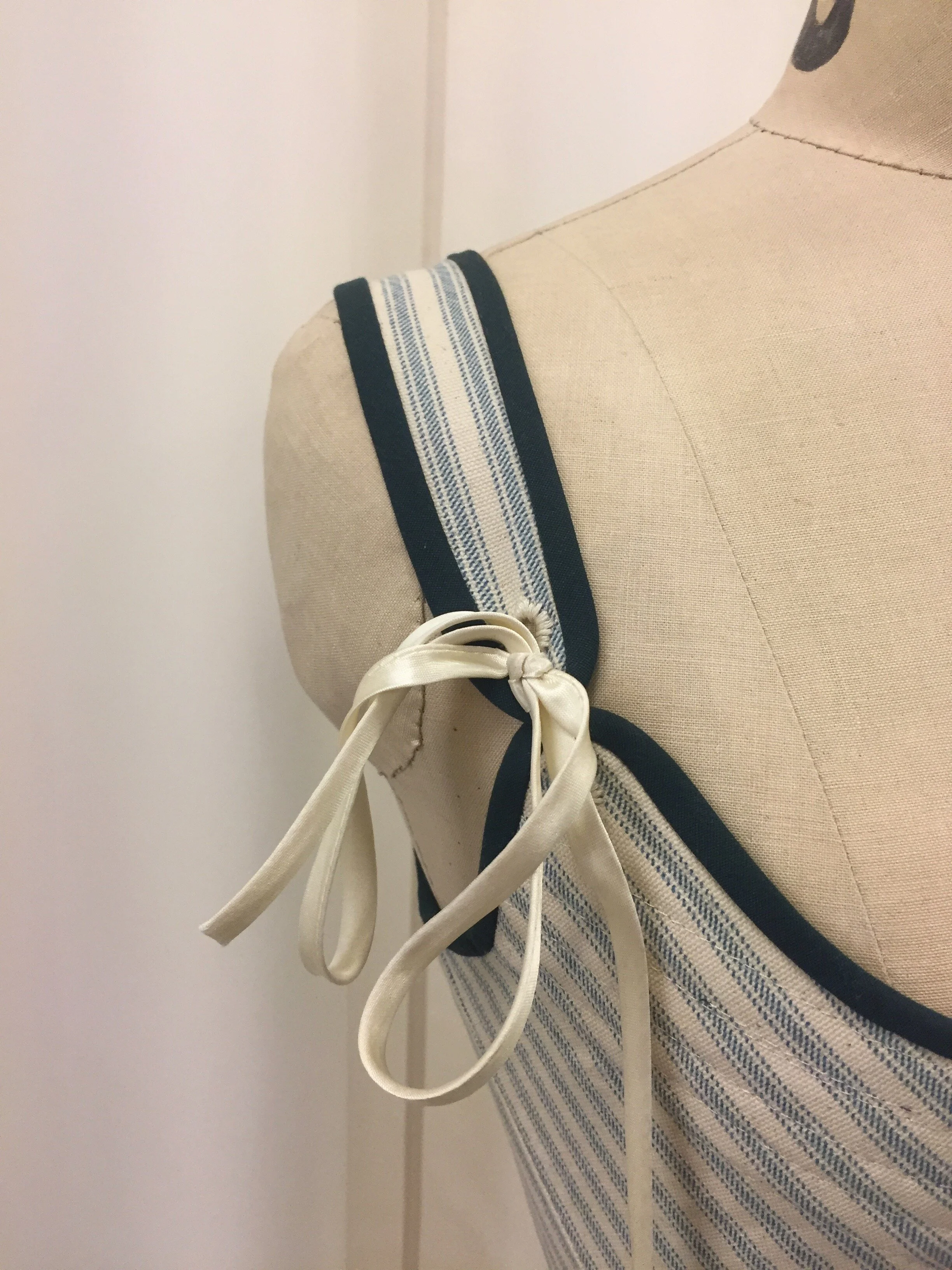 Based on a historical pattern. Features chevron pattern matching, handmade bias binding and bone channels, and hand embroidered eyelets.