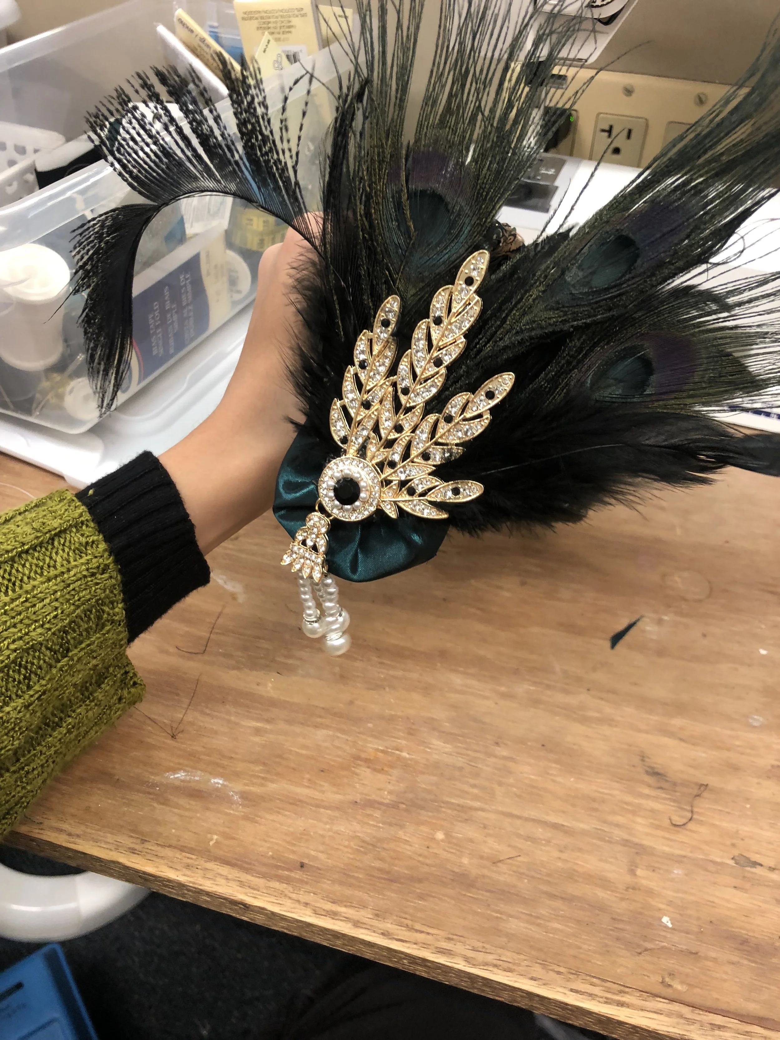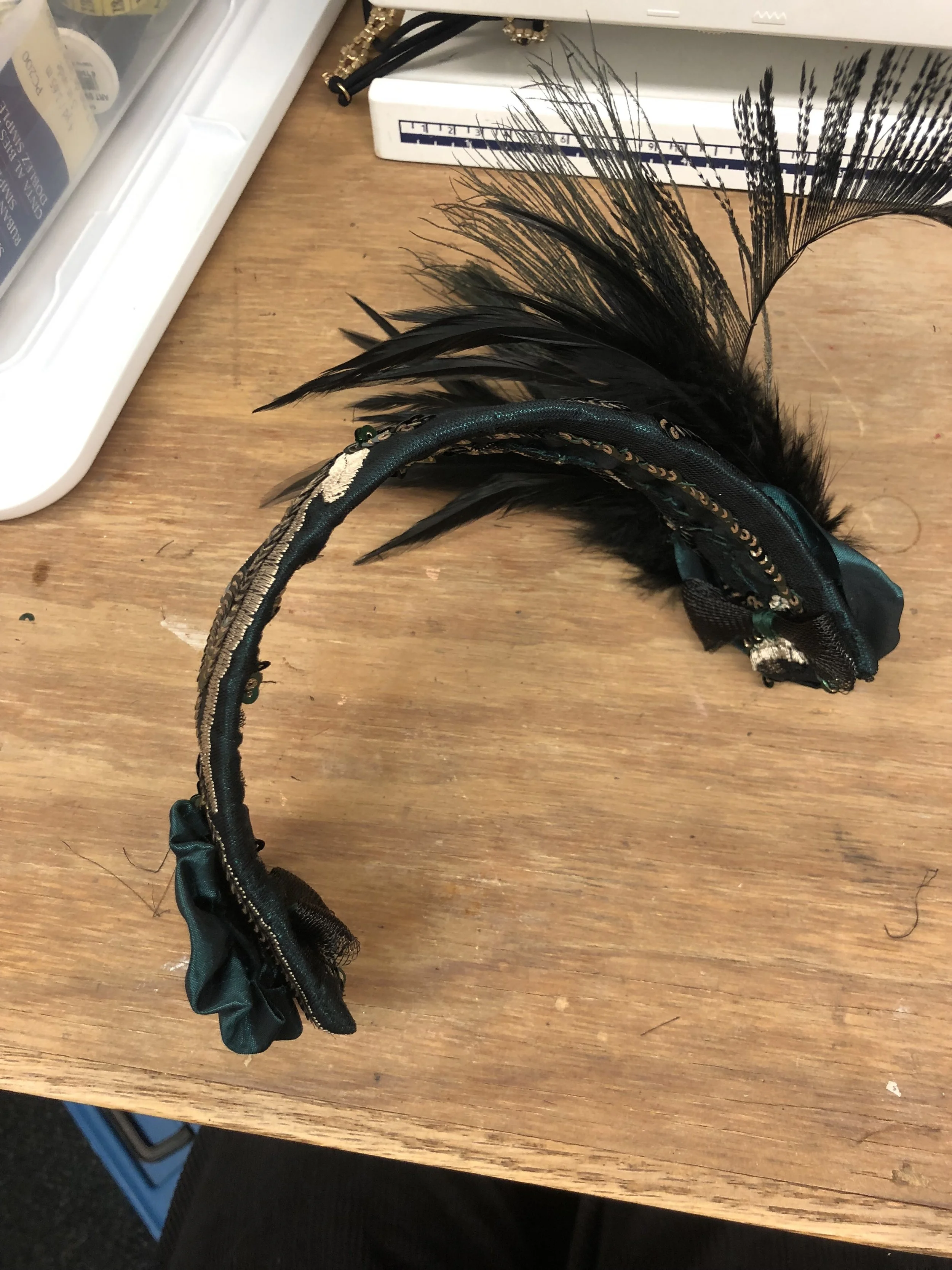 Buckram and wire frame, covered with velvet and lace appliqué. Features hand made rosettes, hand stitched on with feather and jewelry elements. Constructed for Timeline Theatre’s world premiere of Relentless.