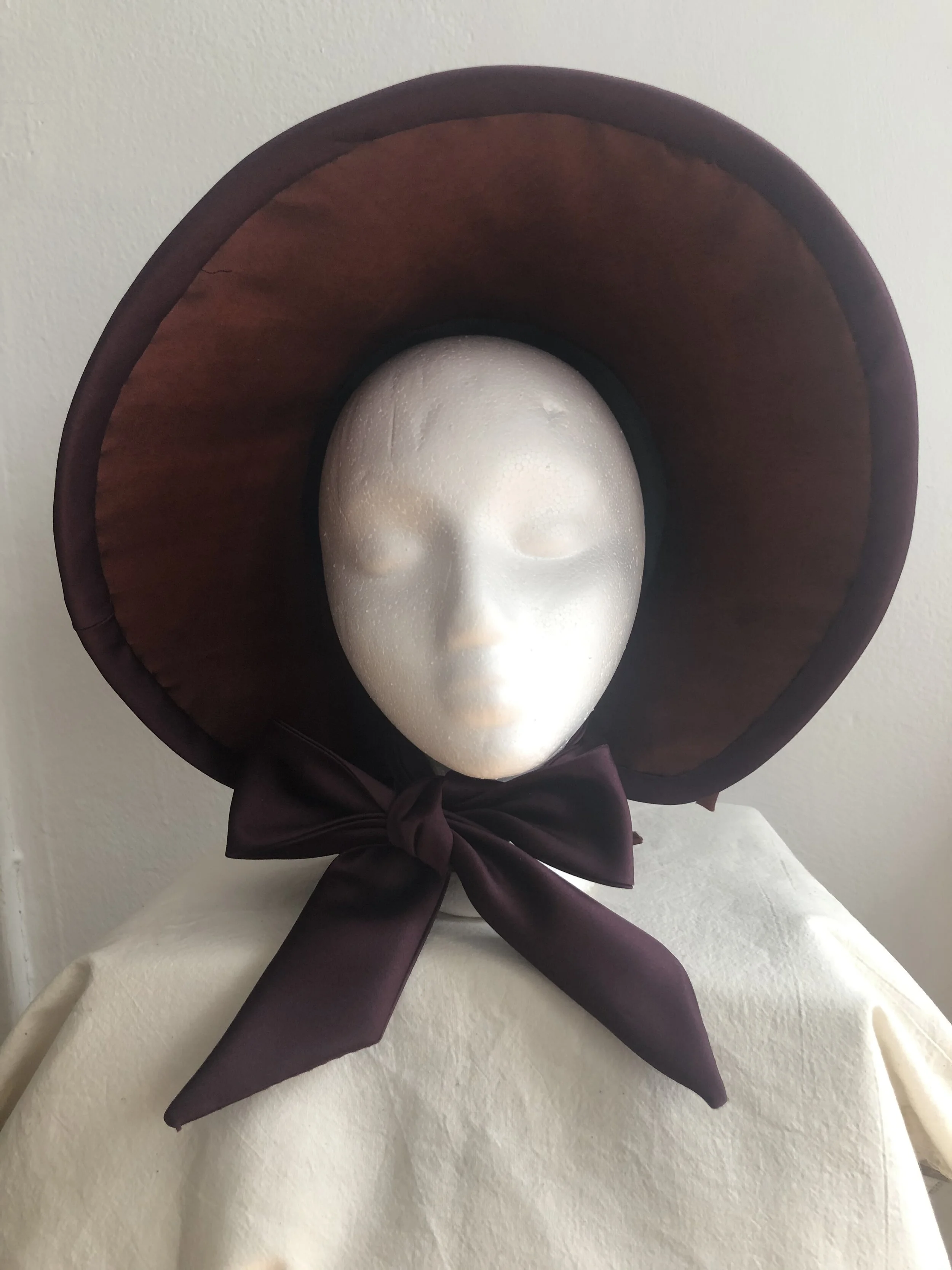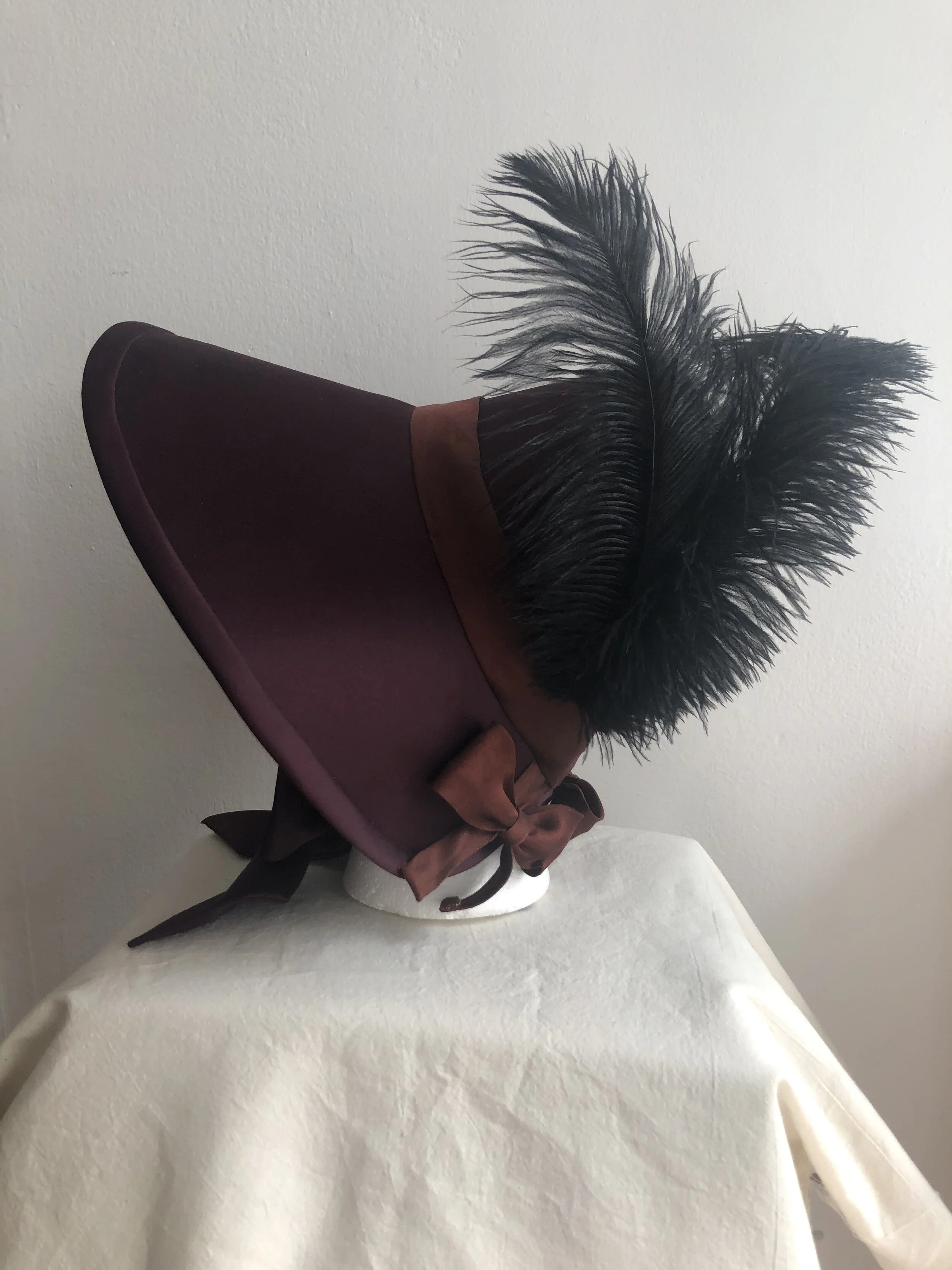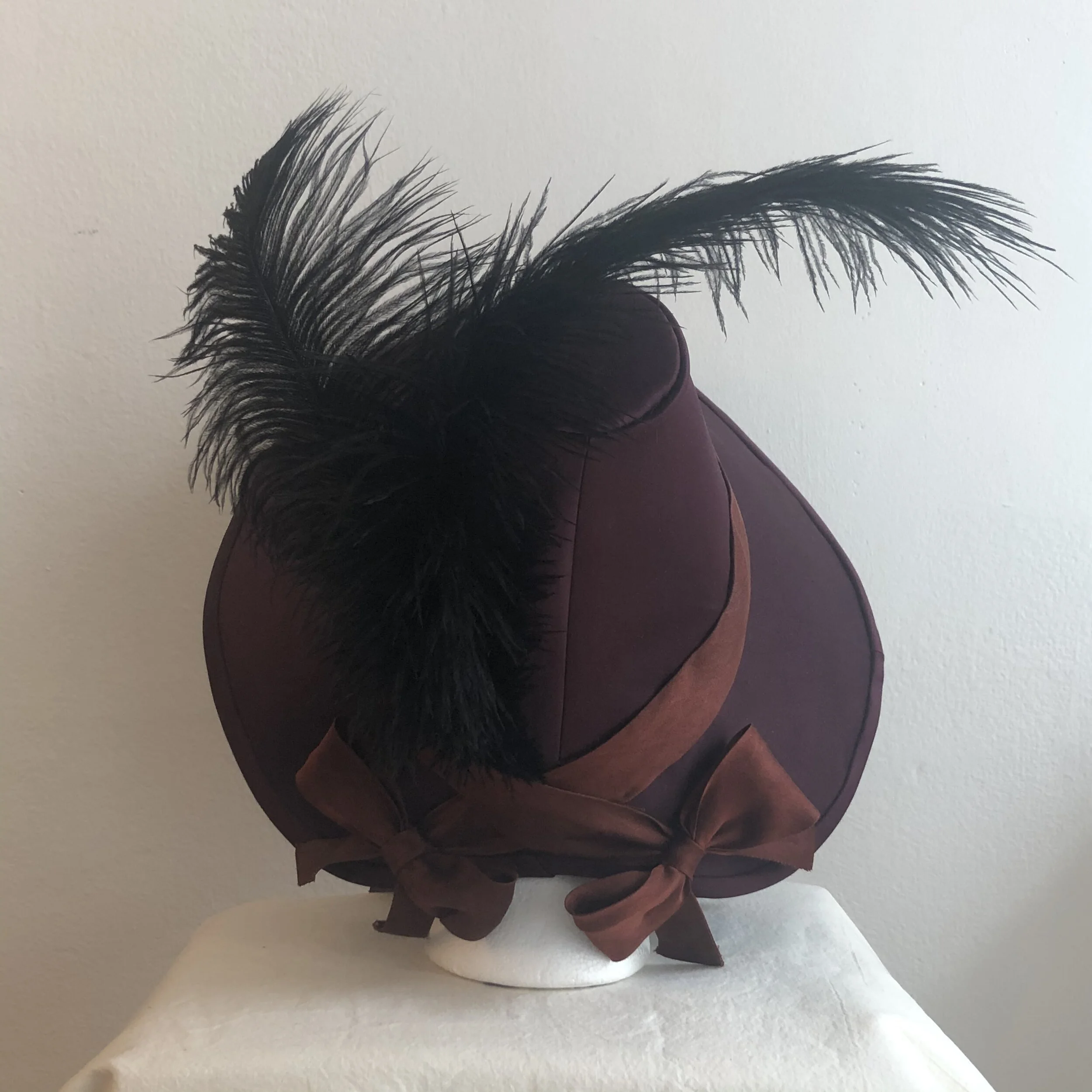 Regency style bonnet made with a buckram base and wire; covered with satin; includes silk and ostrich feather accents. Fully lined.
