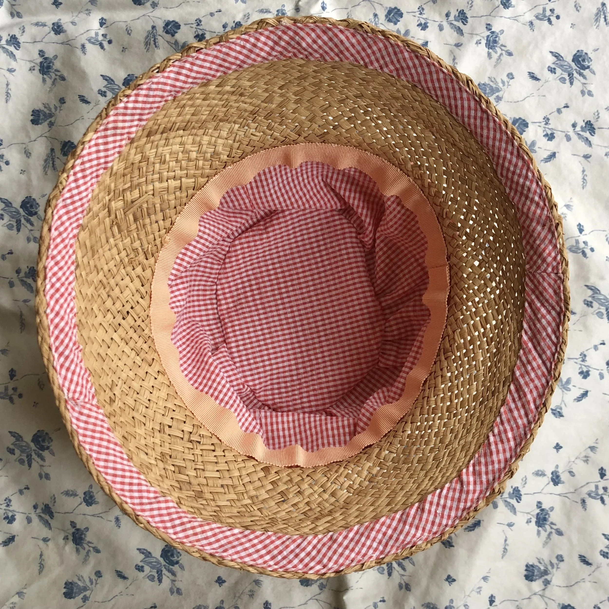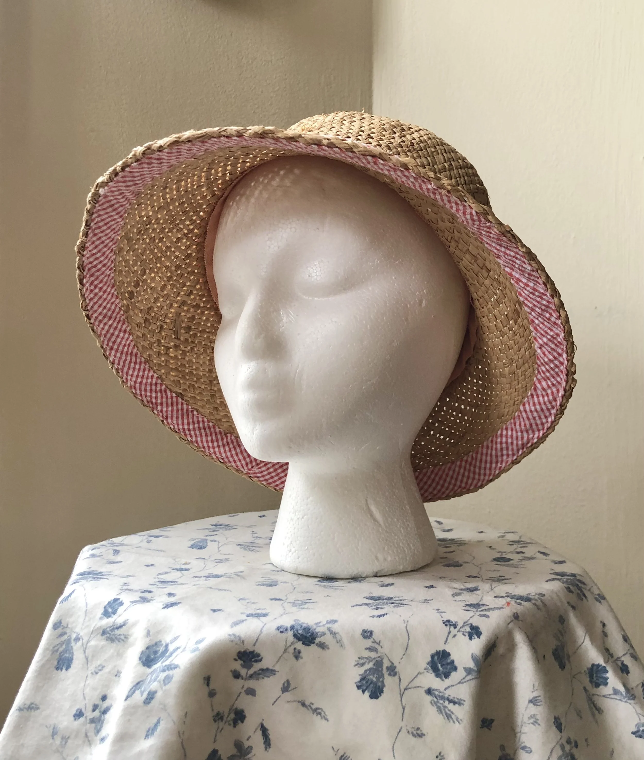 Blocked raffia straw hood, trimmed with fine print gingham. Fully lined.
